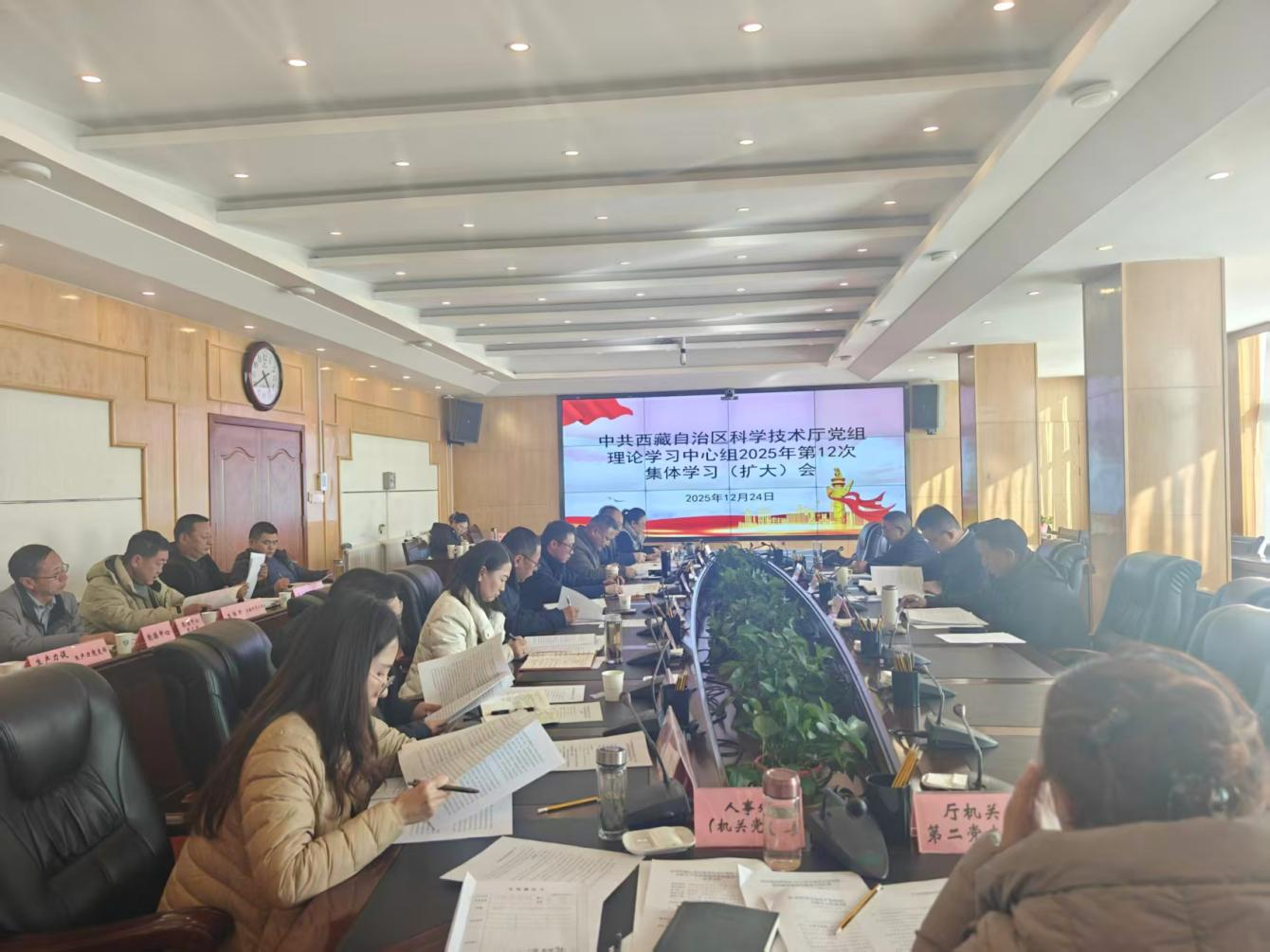 2025年12月24日,自治区科技厅党组召开理论学习中心组2025年第12次集体学习(扩大)会,专题学习2025年中央经济工作会议精神和自治区党委经济工作会议精神,围绕“科技创新引领 助力西藏经济高质量发展”主题开展深入研讨。厅党组副书记、厅长邹振宇主持会议并讲话,中心组成员和各部门(单位)、各党支部负责人参加学习,自治区纪委监委驻教育厅纪检监察组加律副组长莅临指导。