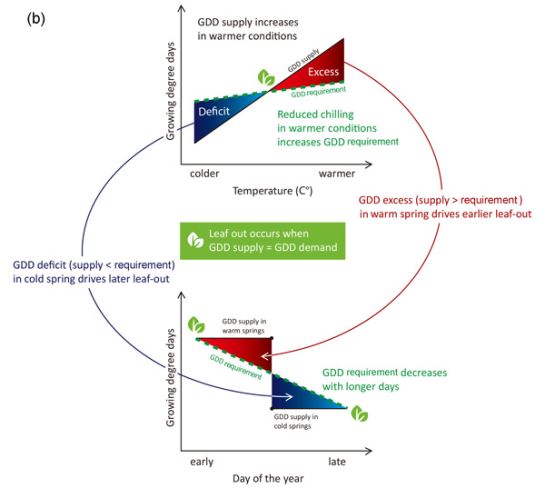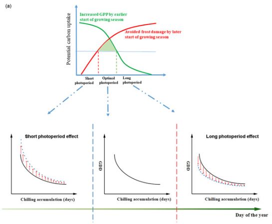 图1, (a) 光周期与温周期协调控制植物春季物候理论框架。GDD代表物候积温需求,Chilling代表冷激需求