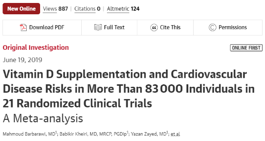 许多早期的研究发现,血液中低水平的维生素D与心血管疾病风险增加有关,并表明维生素D补充剂可能会降低这种风险。Barbarawi领导了这个研究小组,检查了21项临床试验的数据,涉及83000多名患者。一半的患者服用维生素D补充剂,另一半服用安慰剂。数据的荟萃分析显示,两组之间心血管事件的发生率或所有死亡原因没有差异。此外,该研究发现男性和女性以及不同年龄的患者都没有差异。
