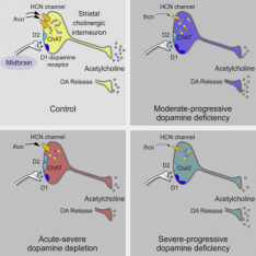 研究人员观察到,在健康小鼠体内,多巴胺和乙酰胆碱的比例保持平衡,这些化学物质的微小变化不会显著影响运动功能。在患有帕金森症的小鼠中,多巴胺的减少降低了纹状体中负责产生乙酰胆碱的一小群细胞的活性。当多巴胺和乙酰胆碱的浓度均下降时,这两种神经递质之间的平衡向有利于乙酰胆碱的方向转移。该研究团队了解到,在这种情况下,帕金森症的运动功能依赖于多巴胺和乙酰胆碱。