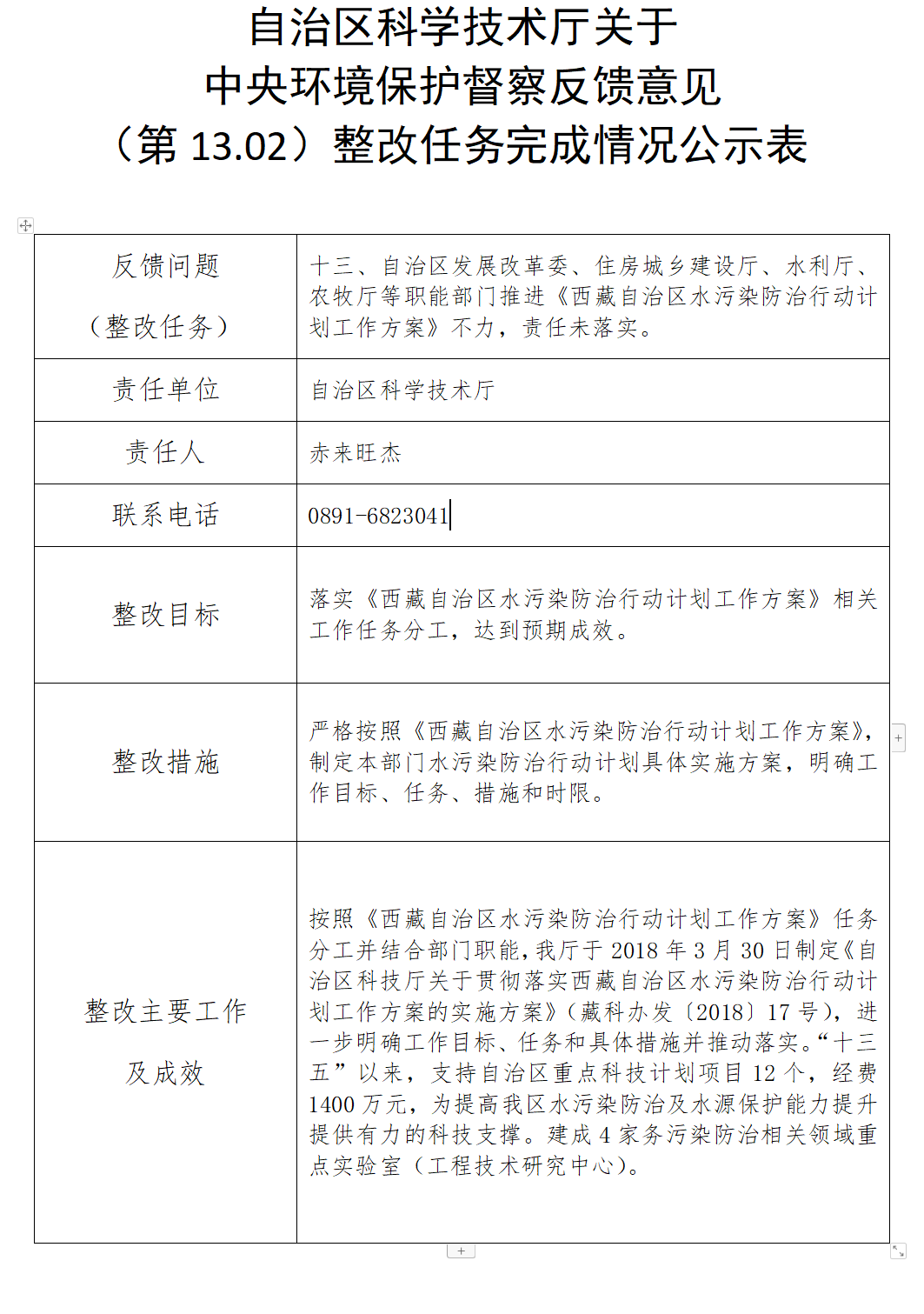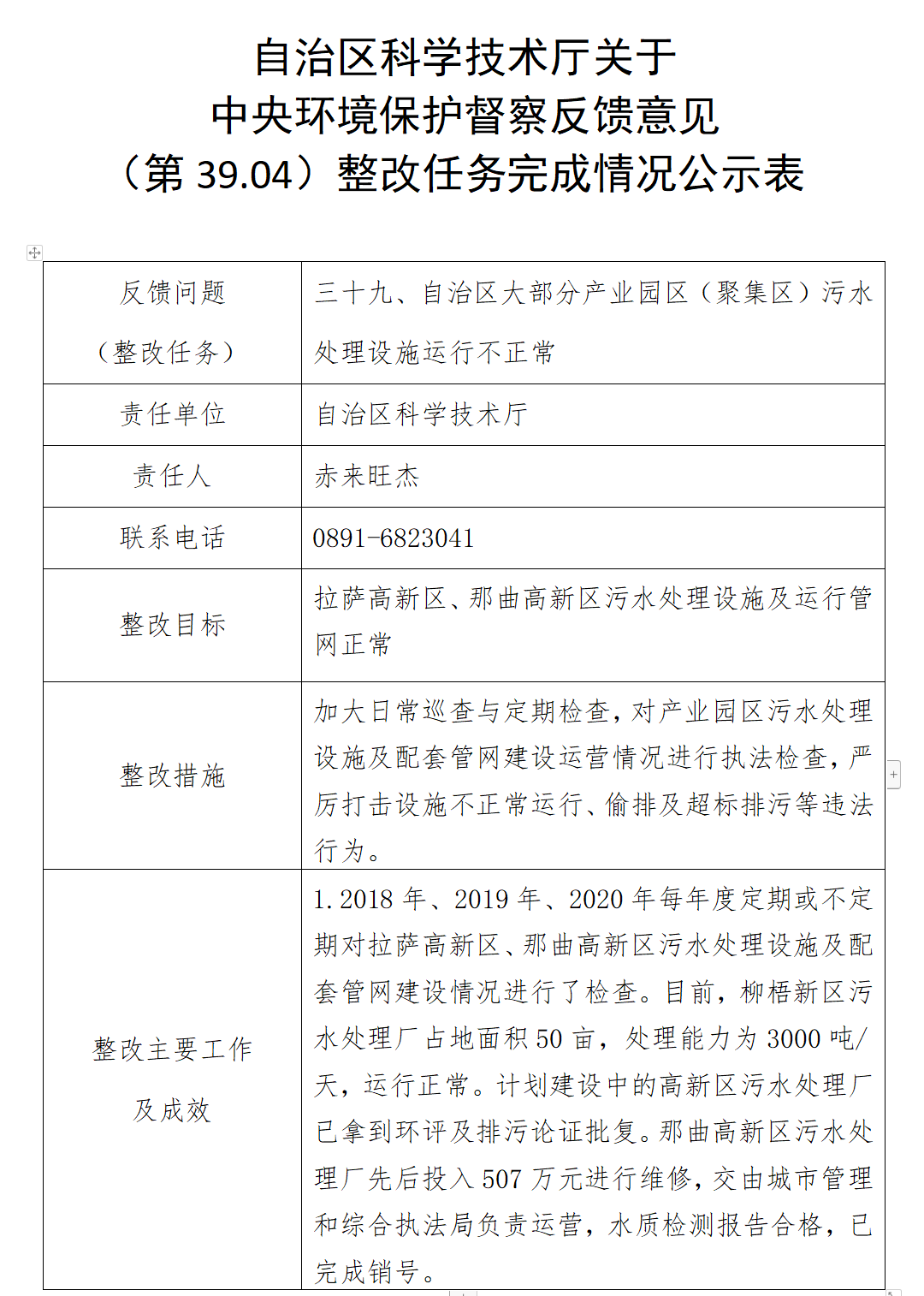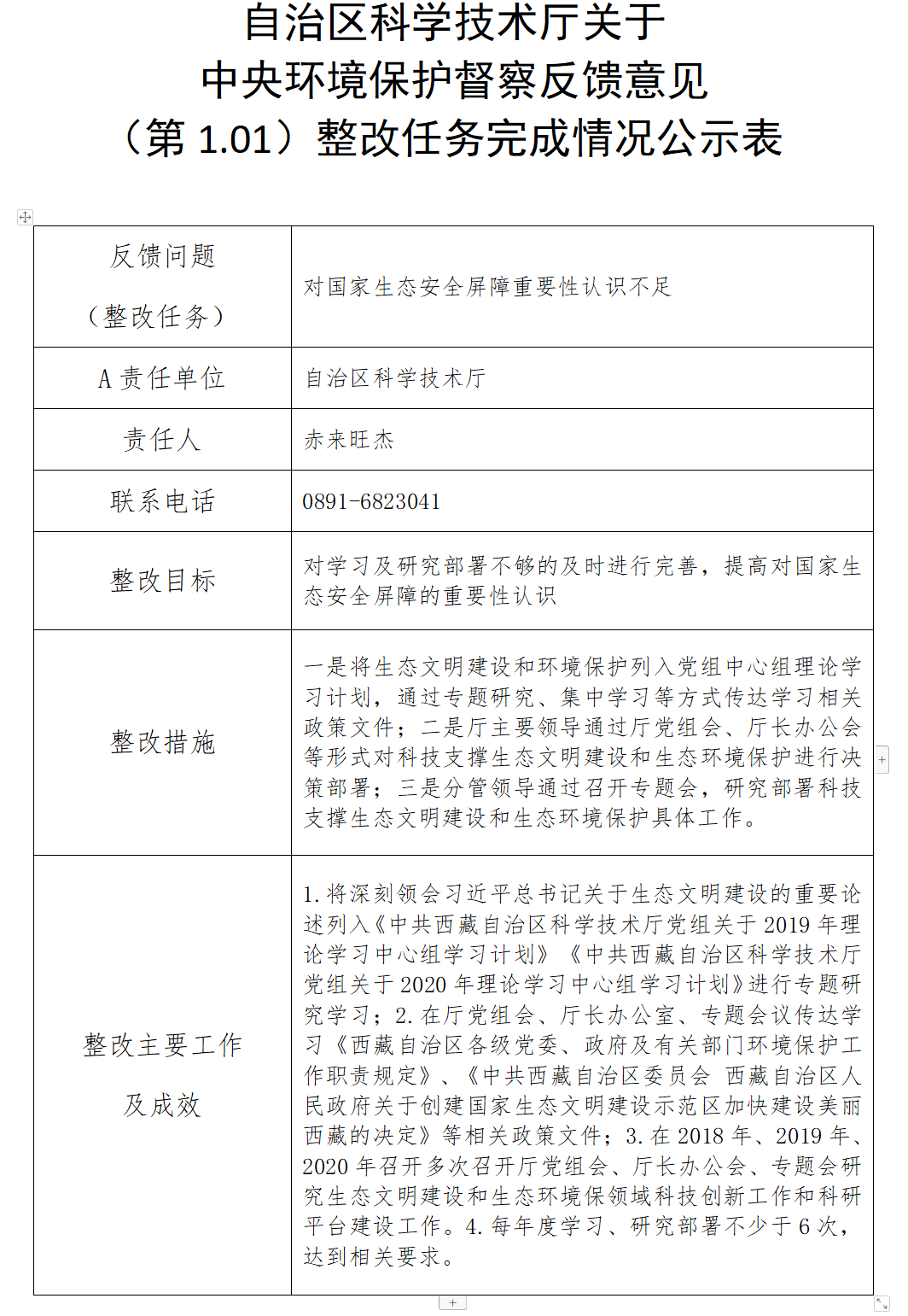 西藏自治区科学技术厅关于中央环境保护督察反馈意见(第1.01项、13.02项、39.04项)整改任务完成情况的公示