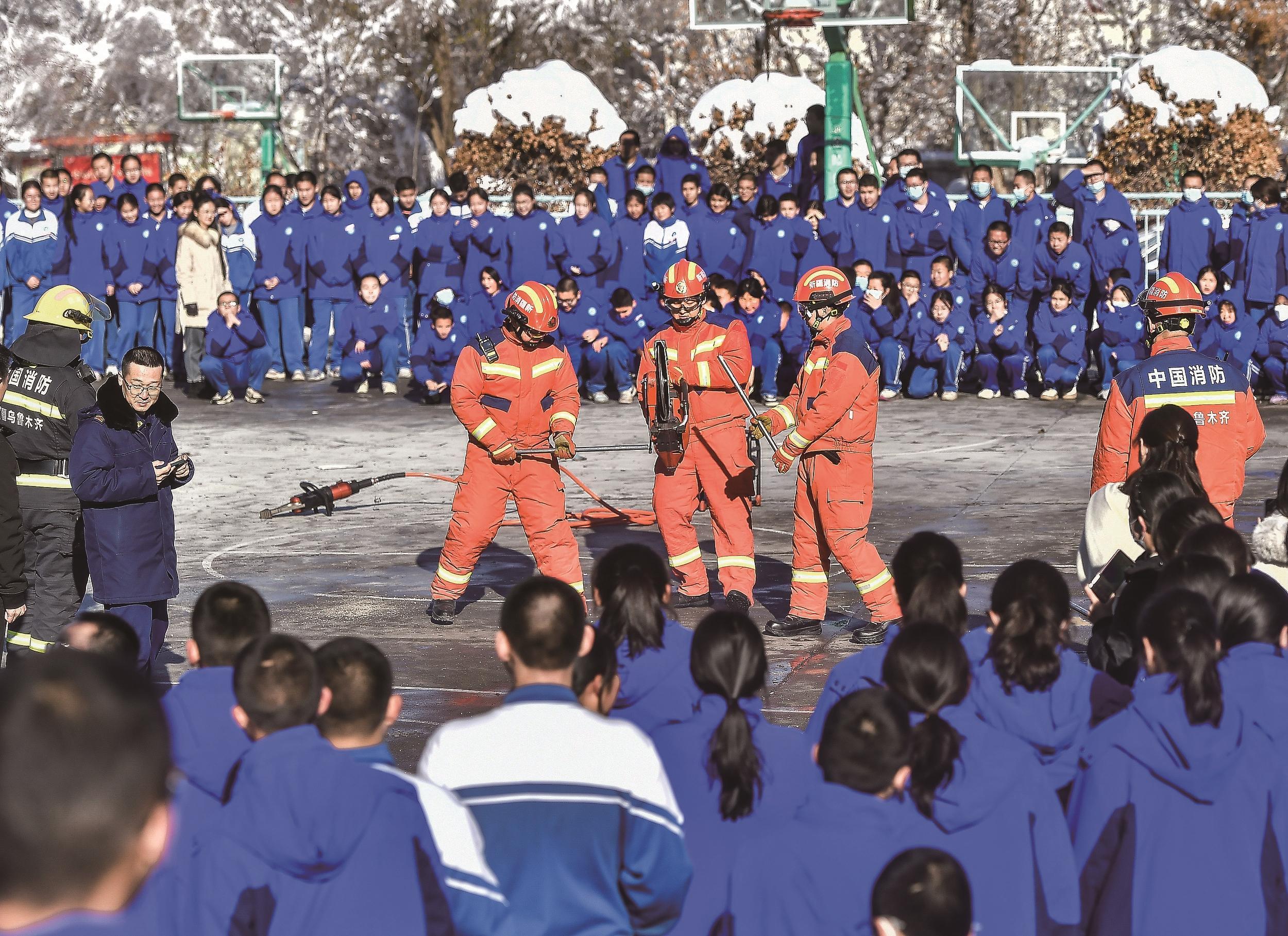 图②: 2025年11月7日,新疆乌鲁木齐市消防救援支队在乌鲁木齐市六十四中学开展“119”消防宣传月活动。视觉中国供图