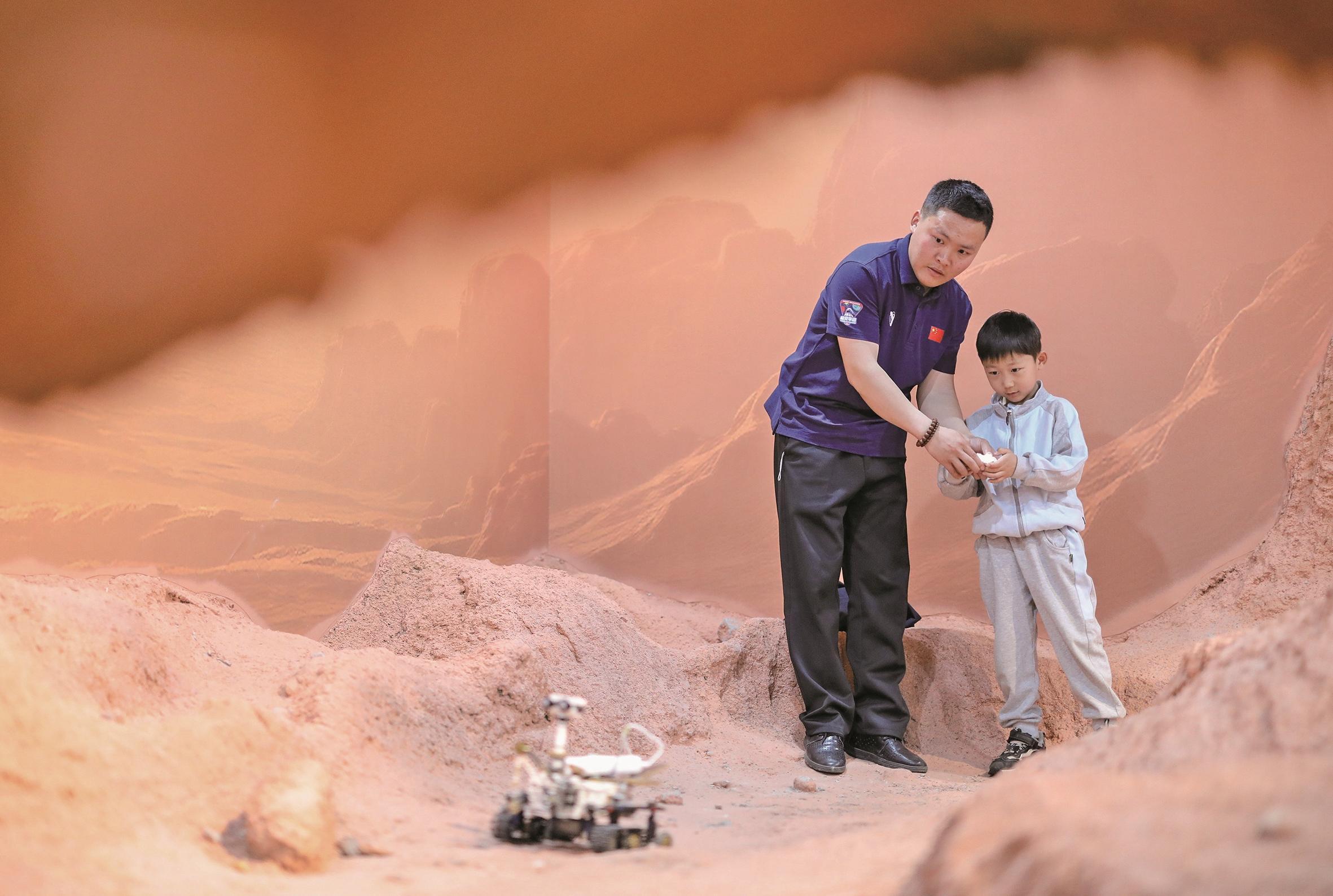 图④: 2025年4月21日,在河南郑州豫见宇宙航天探索中心,讲解员指导参加研学的小朋友体验“火星车”项目。