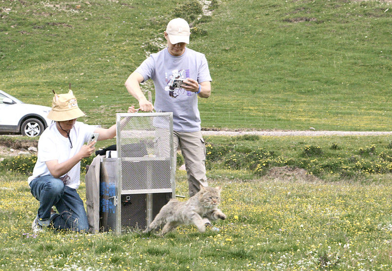 2023年7月23日,在青海省海北藏族自治州海晏县,西宁野生动物园副园长齐新章(左一)和中国农业大学动物医学院副院长金艺鹏放归荒漠猫“黄太急”。(西宁野生动物园供图)