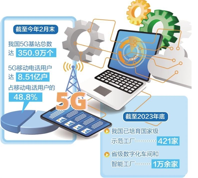 工业和信息化部日前发布数据显示,截至今年2月末,我国5G基站总数达350.9万个,5G移动电话用户达8.51亿户,占移动电话用户的48.8%。数字赋能实体经济水平不断提升,5G行业应用已融入71个国民经济大类,并在工业领域深入推广。