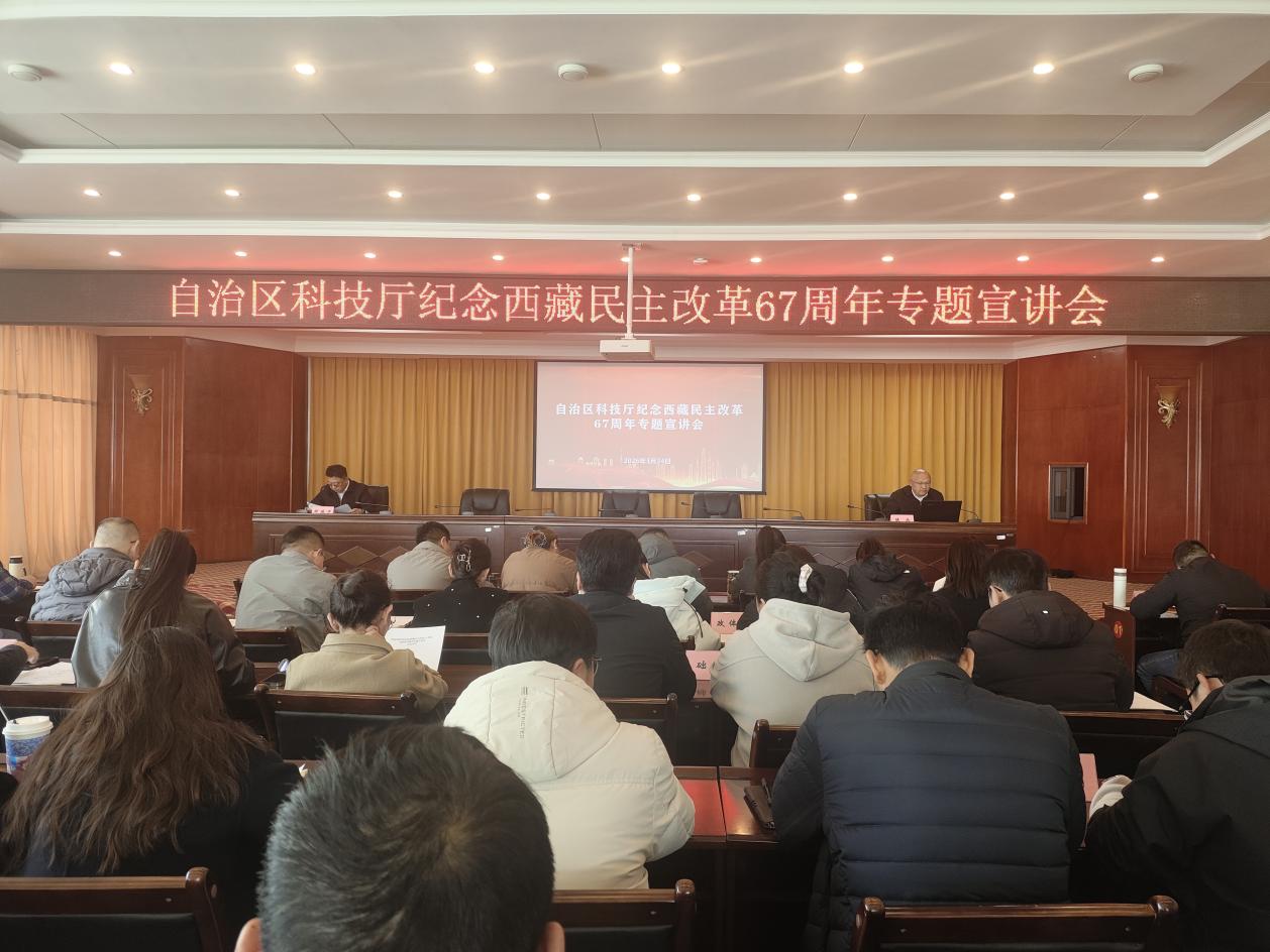 为纪念西藏民主改革67周年,教育引导干部职工坚定不移听党话、感党恩、跟党走。2026年3月24日,自治区科技厅举办纪念西藏民主改革67周年专题宣讲会,邀请中共拉萨市委党校讲师陈乐为全体干部职工作专题辅导宣讲。会议由厅党组副书记、厅长邹振宇主持,厅系统全体干部职工参加。