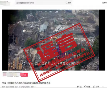 详情:4月7日、8日,新疆阿克苏地区拜城县先后发生5.4、5.1级地震。震中位于无人区,目前暂未收到人员伤亡或财产损失报告,当地通讯、供电、交通正常。但有部分自媒体为博眼球、蹭流量,利用AI智能技术等手段拼凑网络旧图,发布拜城地震不实图文、音视频等信息,严重误导网民。阿克苏地区互联网信息办公室提醒,对在网上蓄意编造、传播散布谣言,扰乱公共秩序等违法行为,网信部门将会同公安机关依法严厉打击。(来源:“新疆网络辟谣”微信公众号)